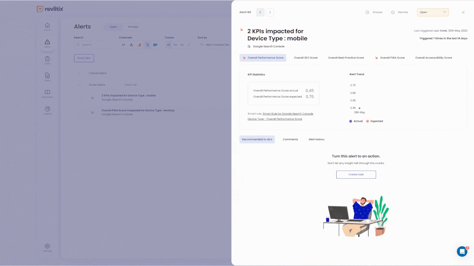 Observe how Revlitix Alerts points out SEO score, accessibility score, and overall performance score. This allows marketers to detect anomalies and take proactive steps to improve search visibility, user experience, and overall website performance.